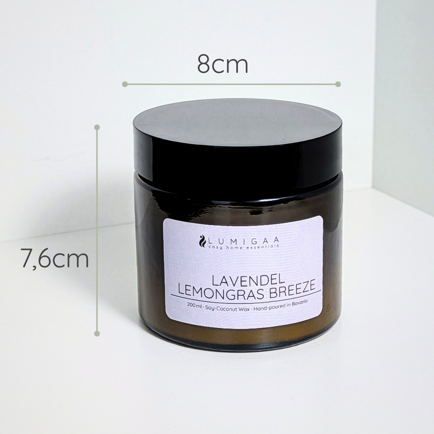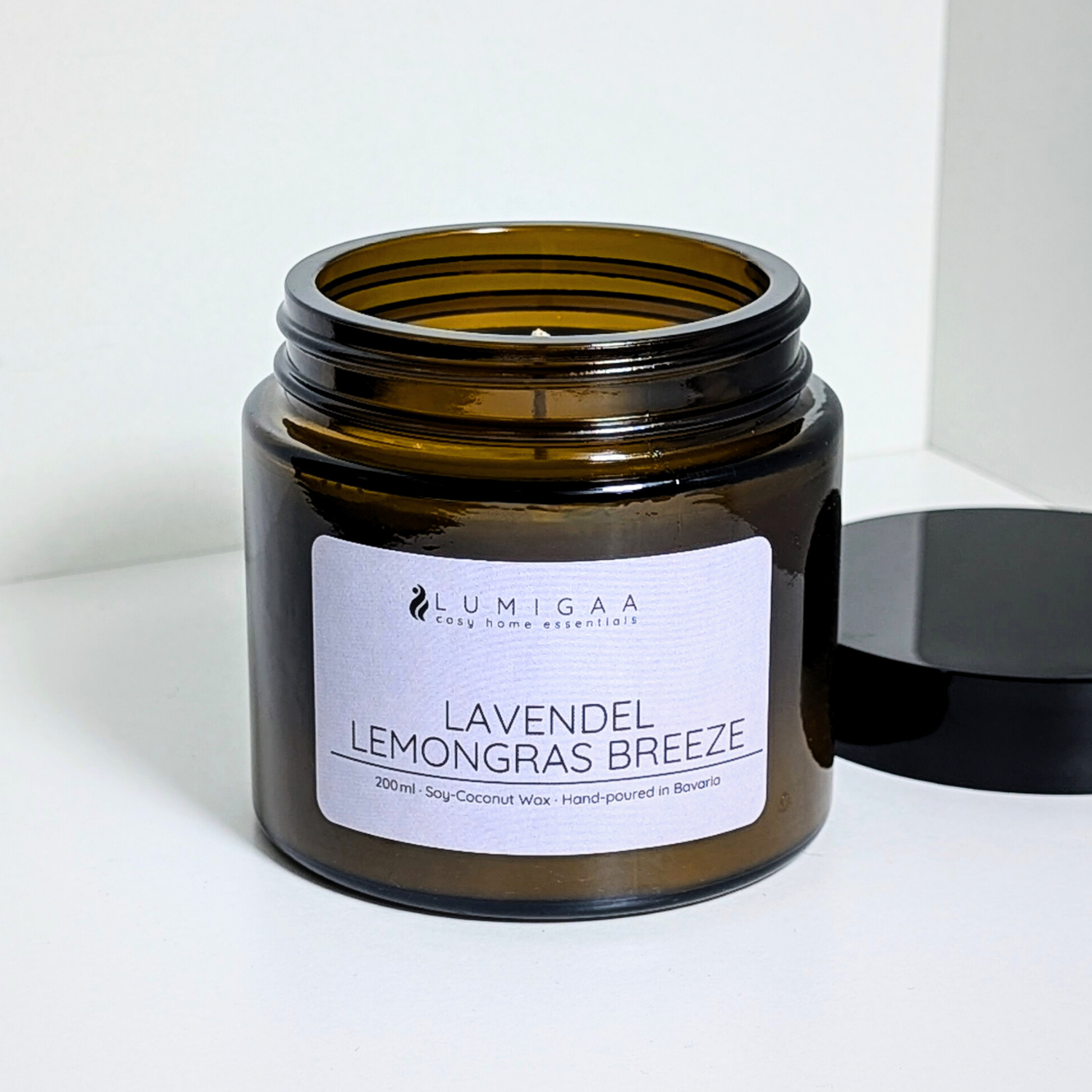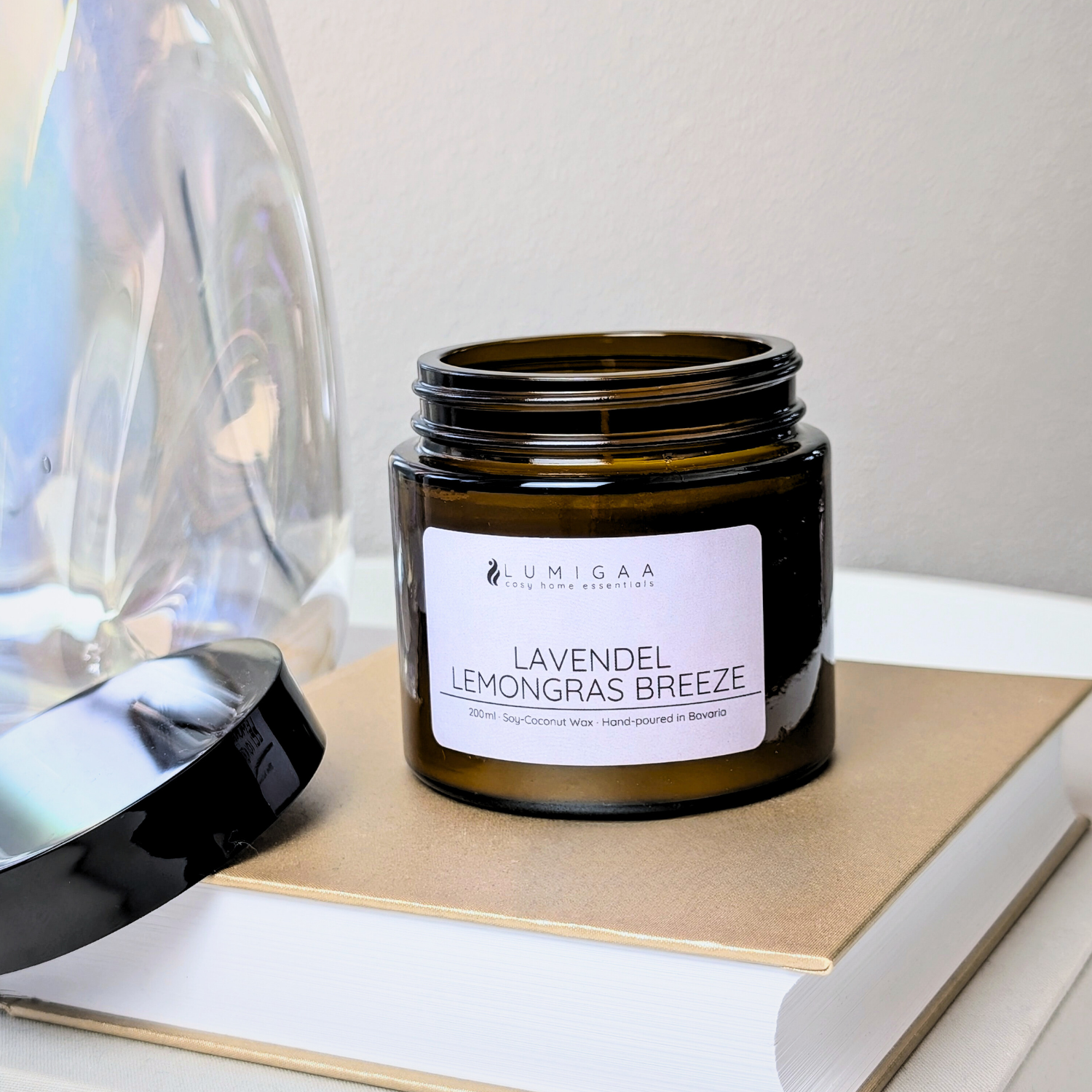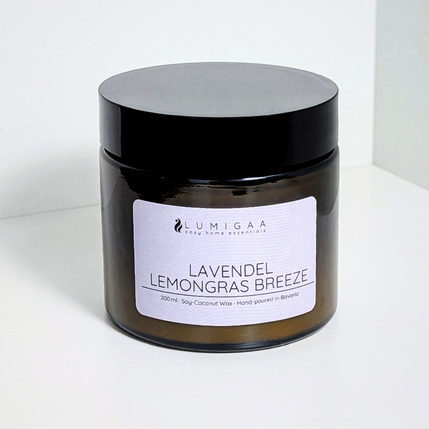Im hochwertigen, braunen Glastiegel mit schwarzem Deckel verbindet sich zarte Lavendelruhe mit der belebenden Frische von Lemongras.